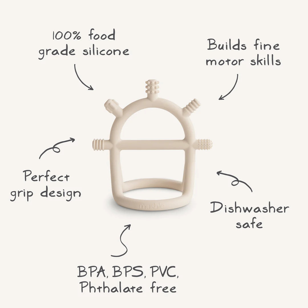 Our no-drop sensory teether will engage your little one’s senses as they discover self-soothing techniques. Made from 100% non-toxic, food grade silicone, this teether is safe for chewing as babies seek relief for sore gums. With an easy-to-grip interior handle, littles can improve fine motor skills while exploring the soothing textured surfaces.